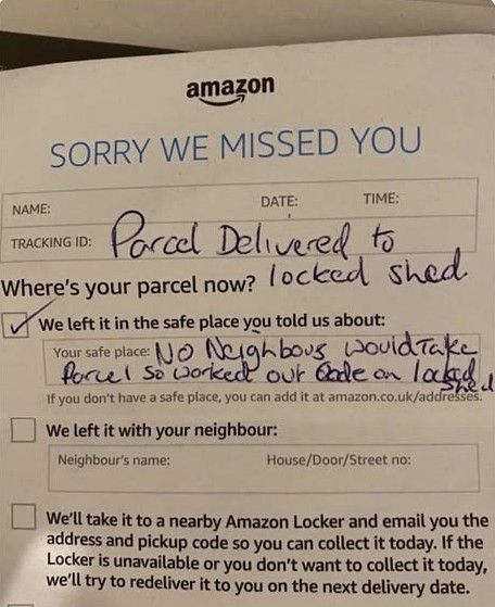 A friend sent me a photo this week of an Amazon delivery note. You may have seen it doing the rounds. It reads, and I am quoting directly here: "Parcel Delivered to locked shed. No neighbours would take parcel so worked out code on locked shed."